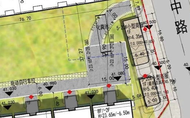 但在平面图上,也存在一些值得推敲的小细节。比如商服楼后面的化粪池,整体被压在消防车道下边,化粪池的结构设计能否满足承受消防车满载时的压力?
