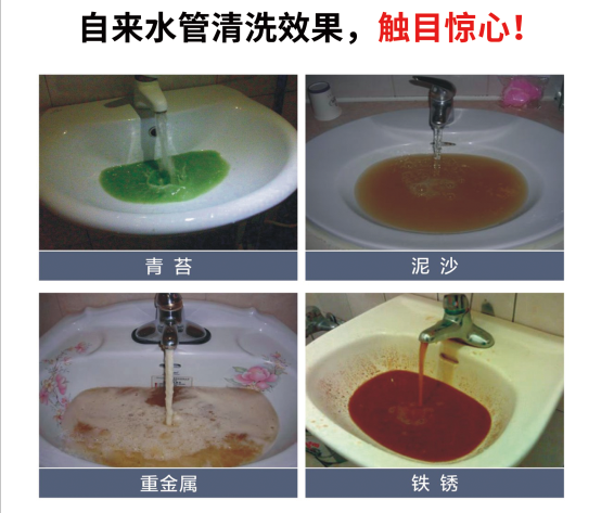 2、国内检测报告显示,自来水管道清洗前的水质比清洗后的水质,浊度高出7倍,由此可见平常的自来水虽然看起来清澈,但因为自来水管壁藏污纳垢,因此水流会把管壁的卡垢一点一滴地带出来,使自来水的浊度高出好几倍。同时还检测出自来水管的洗出水含有铅高0.20mg/L的重金属成分,其中未列入检验项目的重金属成分包括铁、汞、砷镉等。这些重金属、杂菌、微藻植物通过生活用水被人体吸收,在短时间内不会出现很明显状况,但是长期使用这样的水,对人体健康不会有正面的影响,肝癌、肾病、皮肤病及一些精神病状况会也会悄然上身。