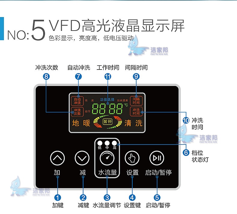 可按需调节冲洗间隔时间,仅需进入机器设置功能,选定时间间隔设置,按机器加减调节按键,即可调节时间间隔数值,调节范围1-99秒。