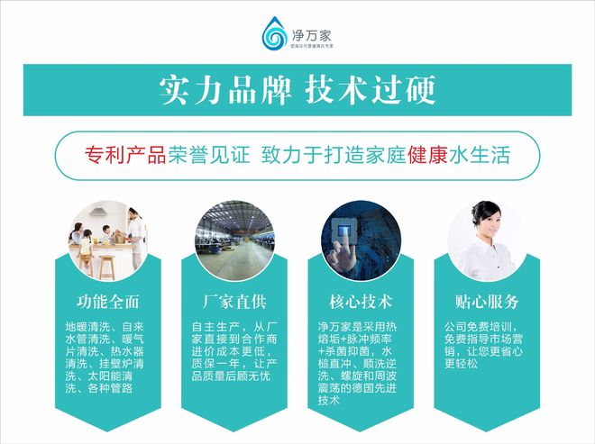 净万家水管清洗设备厂家直销,本公司的管道清洗技术为国内创新、效果理想,水管清洗机功能全面,对水管进行360度无死角进行脉冲清洗。水管清洗设备彻底解决自来水管道污染之难题,公司还会为购买水管清洗设备的合作商Ag真人国际平台进行免费培训,为水管清洗机合作商开展业务进行营销辅导、营销Ag真人国际平台策划,贴心服务每一位与我们合作的朋友,想知道更详细的产品知识可与我们进行电话联系,微信同步。净万家实力品牌,水管清洗设备专利产品,致力打造家庭健康生活。